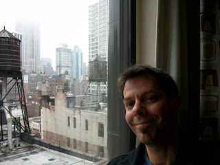 We drove down to NYC from Lowell, Mass on Monday night in fog and driving rain, arriving at the Chelsea Holiday Inn on 26th street around eleven. After we made it up to our 20th floor, we opened the blinds and faced an amazing cityscape of rooftops, skyscrapers, water tanks, and construction cranes. All in the fog.
